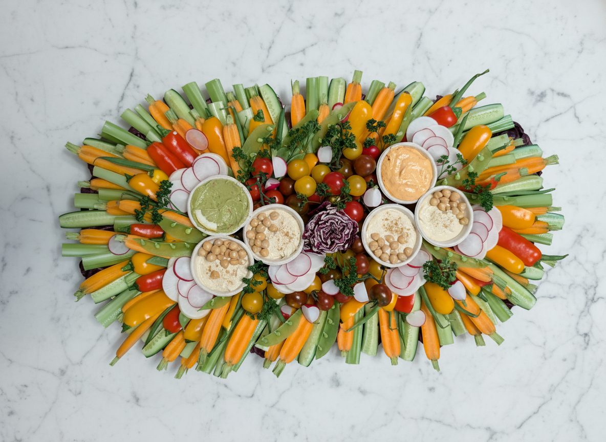 A Crudités Platter is an elegant, French-inspired appetizer featuring beautifully arranged, sliced raw vegetables served with delicious dipping sauces. It is an essential addition to any event because it offers a stunning visual centerpiece with its vibrant colors and provides a light, refreshing, and naturally inclusive option for guests.